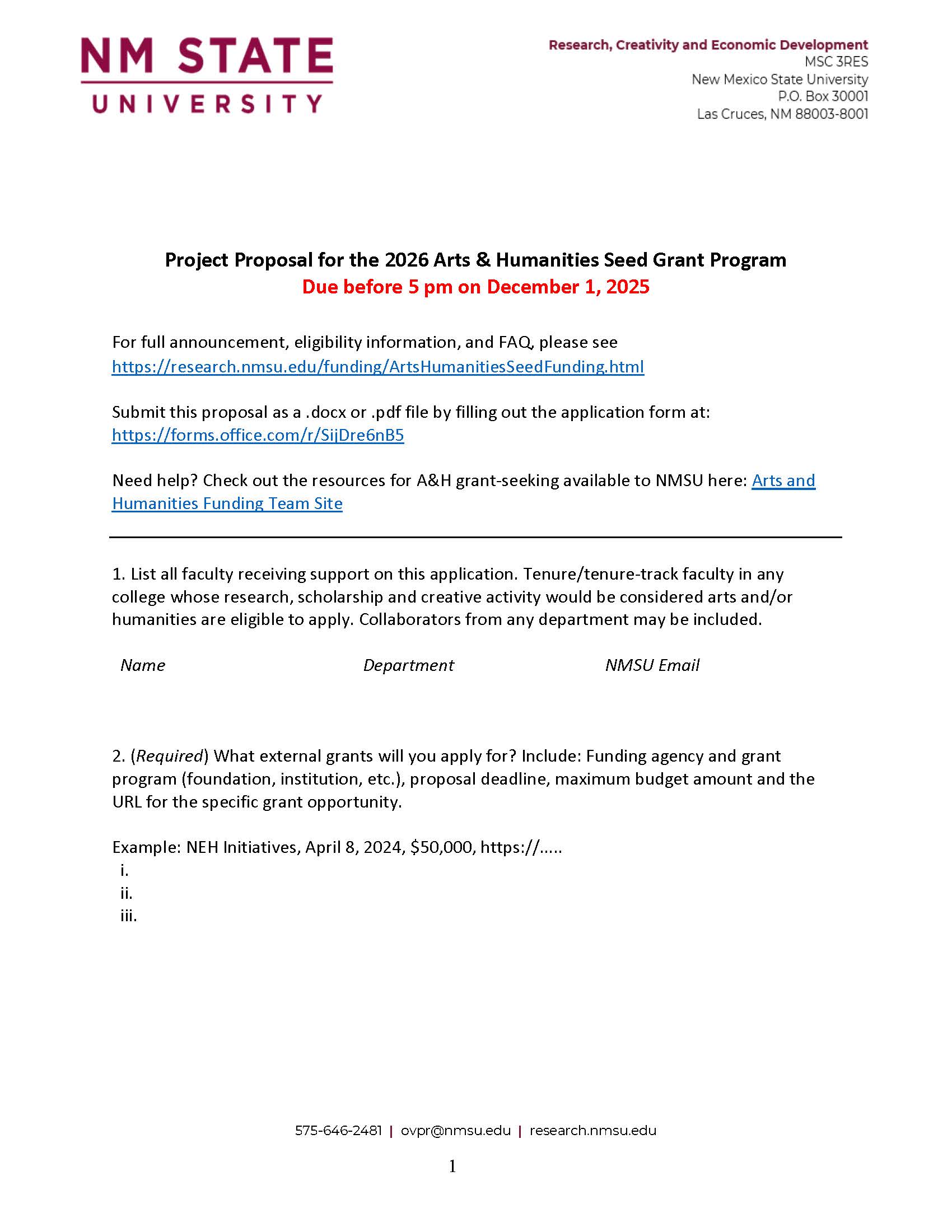 Purpose: The Office of Research, Creativity and Economic Development (RCED) is requesting applications for the 2026 NMSU Arts and Humanities (A&H) Seed Funding Program. The program is designed to help faculty launch new projects in the arts and humanities for which they will seek external funding. It is expected that this multi-year commitment by RCED will result in strong growth in proposal submissions to external funding agencies in support of creative activities. Applications will be awarded based on merit and applications must include an identified opportunity and a clear plan to submit a proposal will have the highest priority.